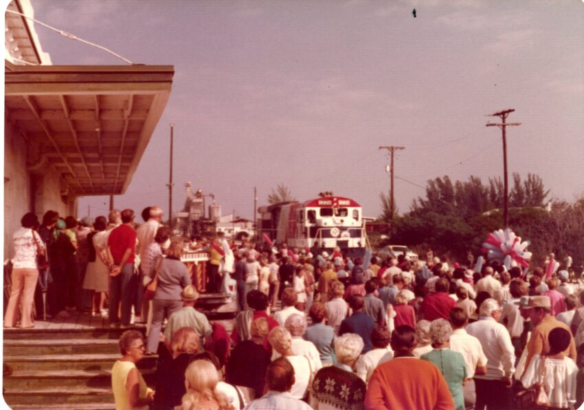 Seaboard Coast Line locomotive marked "1776" pulling up at the railroad's Naples Depot. Large crowd of people in foreground and standing on depot's east side loading dock. Courtesy of Collier County Museums.
