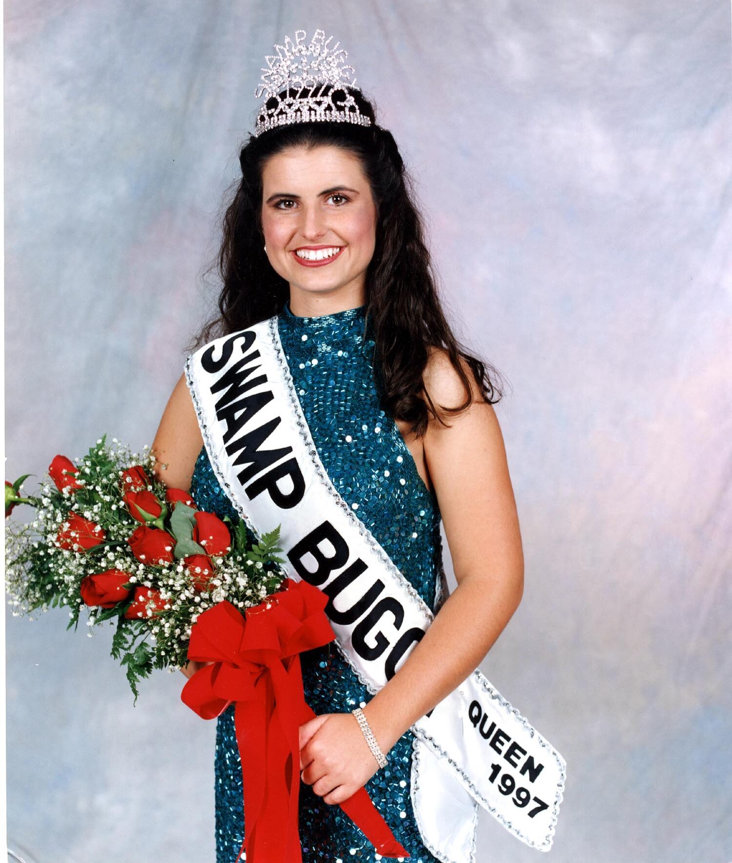 1997 Swamp Buggy Queen Stacy McDonald in crown and sash holding bouquet of red roses. McDonald's sponsor was Don DeVoe and Sunshine Buick and Isuzu. Parents are Gail Hambright and Larry McDonald. Courtesy of Collier County Museums.