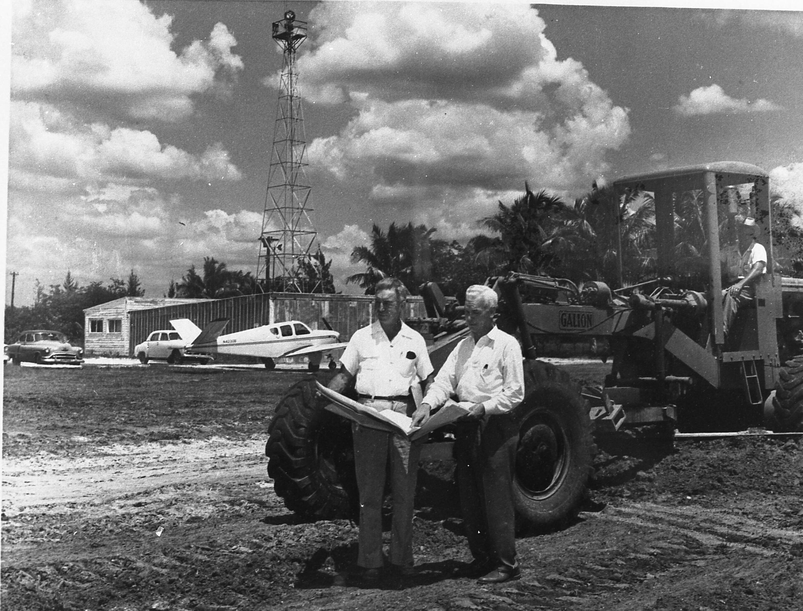 County Engineer Harmon Turner (right) examining plans with Mr. Albin Gerish on construction of airport in Everglades City. Small airplane, hangar and road grader in background. Courtesy of Collier County Museums.