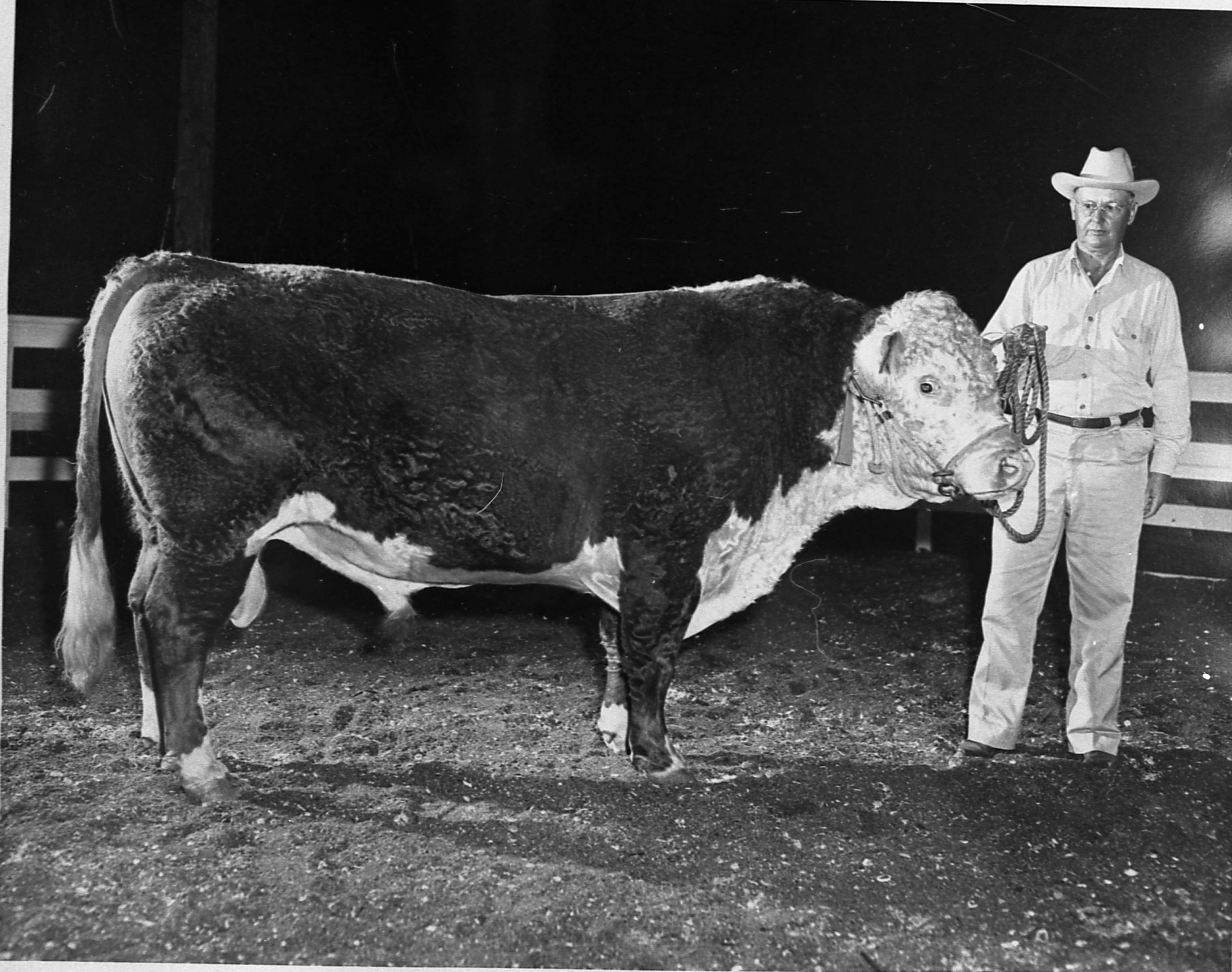 Unidentified rancher leading a Hereford bull in a corral during a livestock show in Immokalee, 1951. Courtesy of Collier County Museums.