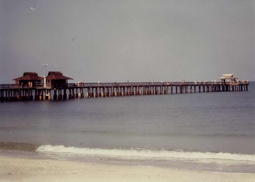 Photographic collection of Naples Historic Homes. NAPLES PIER. The original 600-foot pier was built in 1887-8 to handle cargo and later, hotel passengers. Destroyed by a hurricane in 1910. Rebuilt and burned in 1922. Extended to 1,000 feet in 1924. Present pier replaced the one destroyed by Hurricane Donna in 1960. Black ink stamp on reverse reads" Janet C. Cutler, 5114 19th Ct SW, Naples, FL 33999 Courtesy of Collier County Museums.