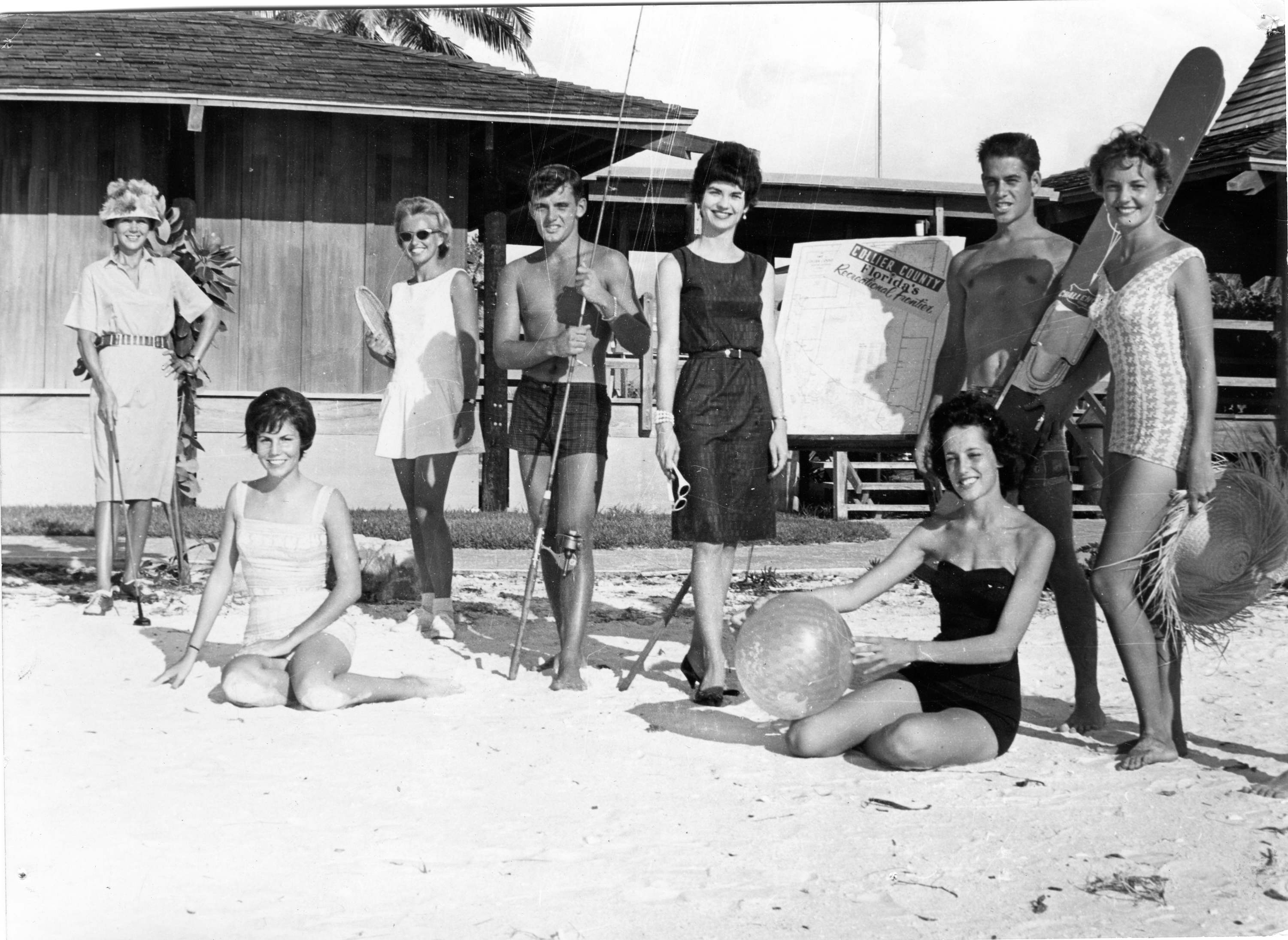 Group of 8 unidentified people in various recreational outfits posed in front of a map that reads "Collier County, Florida's Recreational Frontier". Probable location Lowdermilk Park.