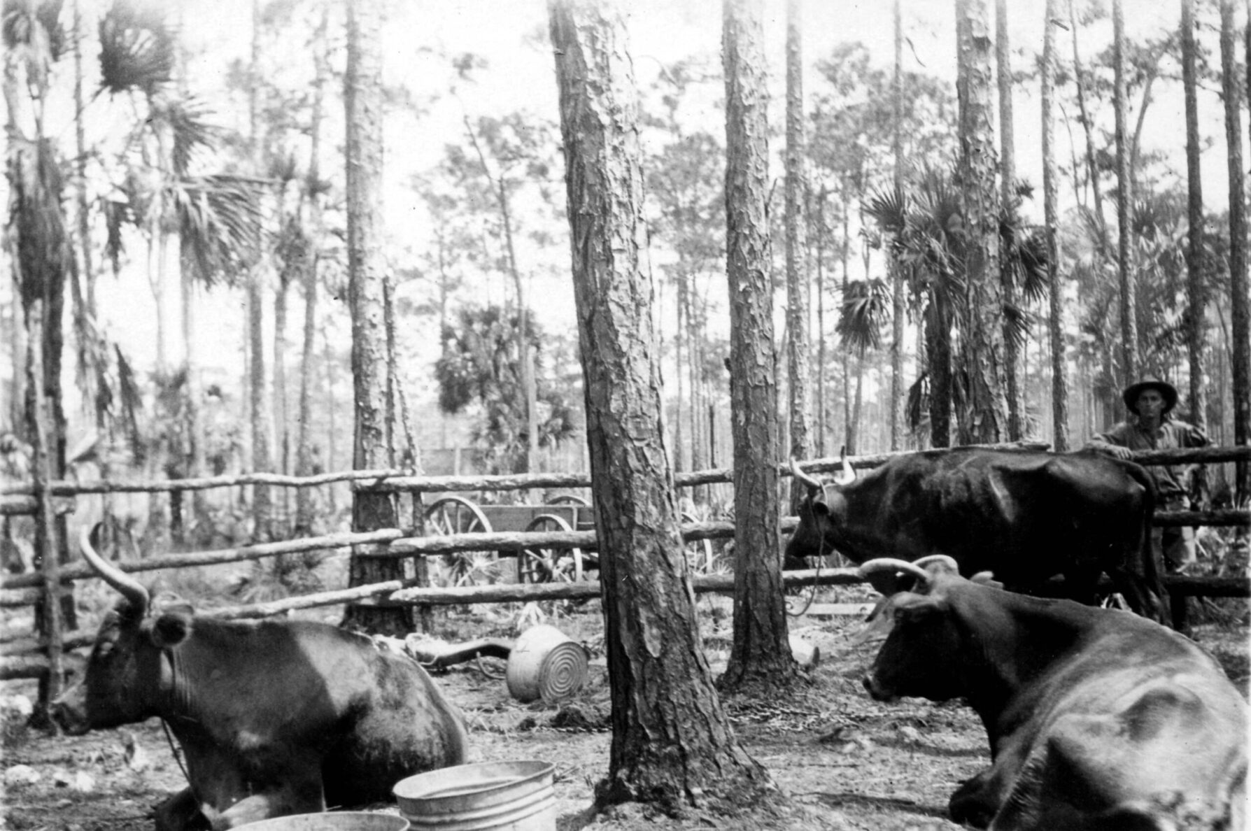 Chester Walker in foreground. Dutch Bailie standing by tree. Bob Veilhauer in glasses at Corkscrew Swamp. Bailie, a former stone mason and plasterer in Miami, purchased property adjoining Corkscrew Swamp Sanctuary on the NE corner. He got into the cattle business in Collier County and was instrumental during the Sanctuary's early days. Before there were any roads, he would transport visitors in his Jeep and watched for trespassers. He died in the 1960s. Source: The Acquisition and Development of the Corkscrew Swamp Sanctuary 1952-67 by Carl W. Buchheister. Courtesy of Collier County Museums.