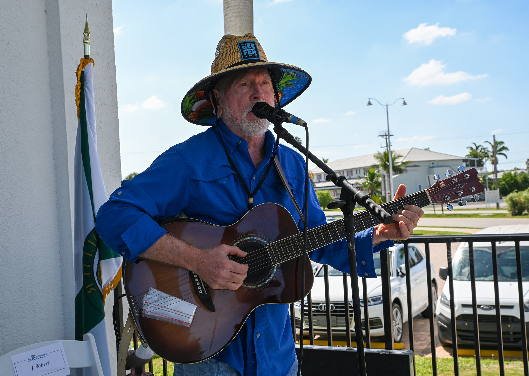 From left to right, unknown, Museum of the Everglades Manager Donna Ridewood, Mayor Sammy Hamilton, Friends of the Museum of the Everglades President Pauline Reeves and Museum Director Ron Jamro pictured under the sign on U.S. 41 that reads "Everglades City, Florida's Outstanding Rural Community of the Year, 1998". Courtesy of Collier County Museums.
