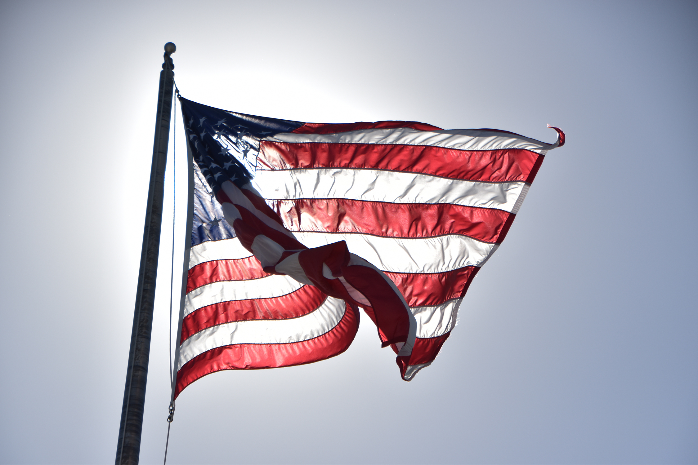 American Legion members with flags marching in Naples Centennial parade past Wynn's Family Market. American Legion vehicle driving behind marchers. Courtesy of Collier County Museums.
